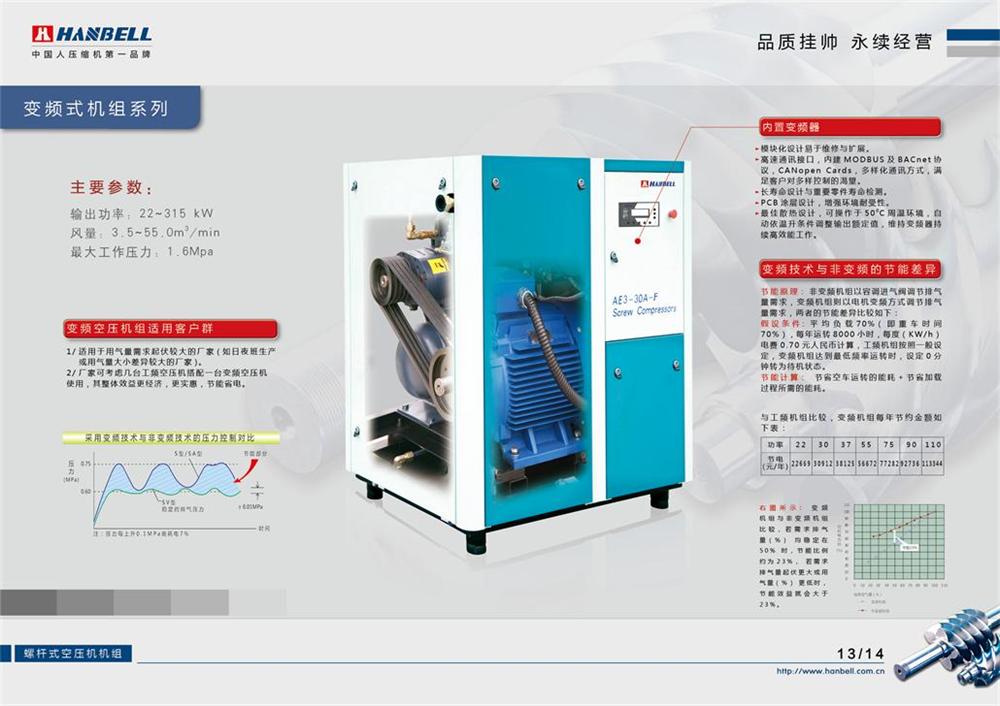 主要參數:輸出功率:22~45kW風量:3.6~7.1m3/min最大工作壓力:1.6Mpa 變頻空壓機組適用于用氣量需求起伏較大的廠家(如日夜班生產或用氣量大小差異較大的廠家)。廠家可考慮幾臺工頻空壓機搭配一臺變頻空壓機使用,其整體效益更經濟,更實惠,節(jié)能省電。內 置 變 頻 器模塊化設計易于維護與擴展。高速通訊接口,內建MODBUS及BACnet協(xié)議,CANopen Card s,多樣化通訊方式,滿足客戶對多樣控制的渴望。長壽命設計與重要零件壽命零件。PCB涂層設計,增強環(huán)境耐受性。最佳散熱設計,可操作于50°C周溫環(huán)境,自動以溫升條件調整輸出額定值,維持變頻器持續(xù)高效能工作。變頻技術與非變頻的節(jié)能差異節(jié)能原理:非變頻機組以容調進氣閥調節(jié)排氣量需求,變頻機組則以電機變頻方式調節(jié)排氣量需求,兩者的節(jié)能差異如下:假設條件:平均負載70%(即重車時間70%),每年運行8000小時,每度(KW/h)電費0.70元人民幣計算,工頻機組按照一般設定,變頻機組達到最低頻率運轉時,設定0分鐘轉為待機狀態(tài)。節(jié)能計算:節(jié)能空車運轉的能耗+節(jié)能加載過程所需的能耗。